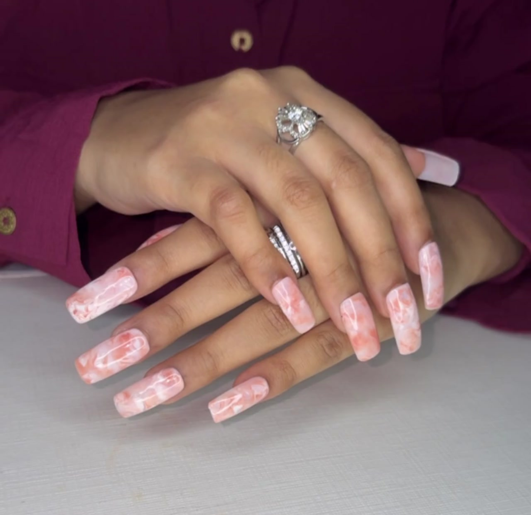 Soft blush pink meets white marble for a calm, classy look 💗🤍. The glossy finish catches light beautifully, while the long square shape makes your fingers look sleek and elegant. Each nail has a unique marble pattern, hand-crafted with gentle swirls so the set feels special and refined.