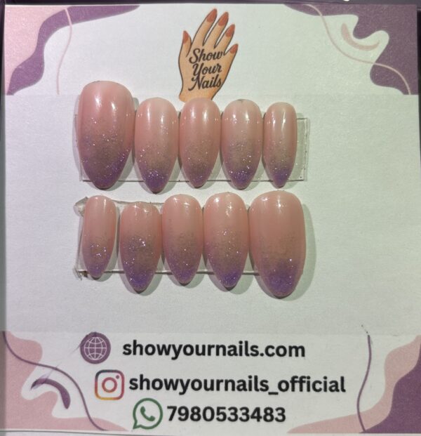 A soft blush-pink base kissed with lavender glitter tips β€” a dreamy gradient that gives an elegant, feminine finish, perfect for daily wear and special moments.