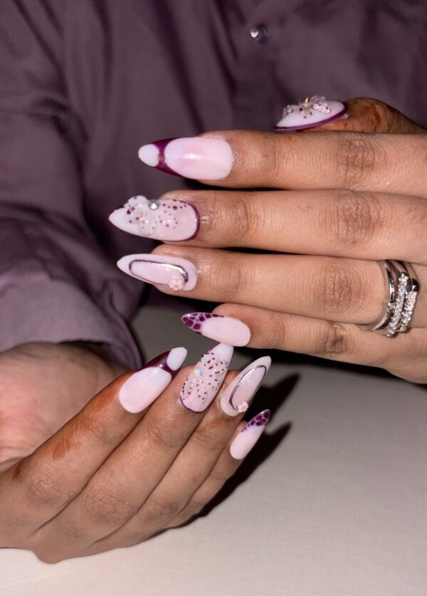 A gentle purple base paired with silver sparkle and a unique mix of 3D flowers, chrome strokes and soft french tips β designed to bring a sweet and elegant look to your hands.