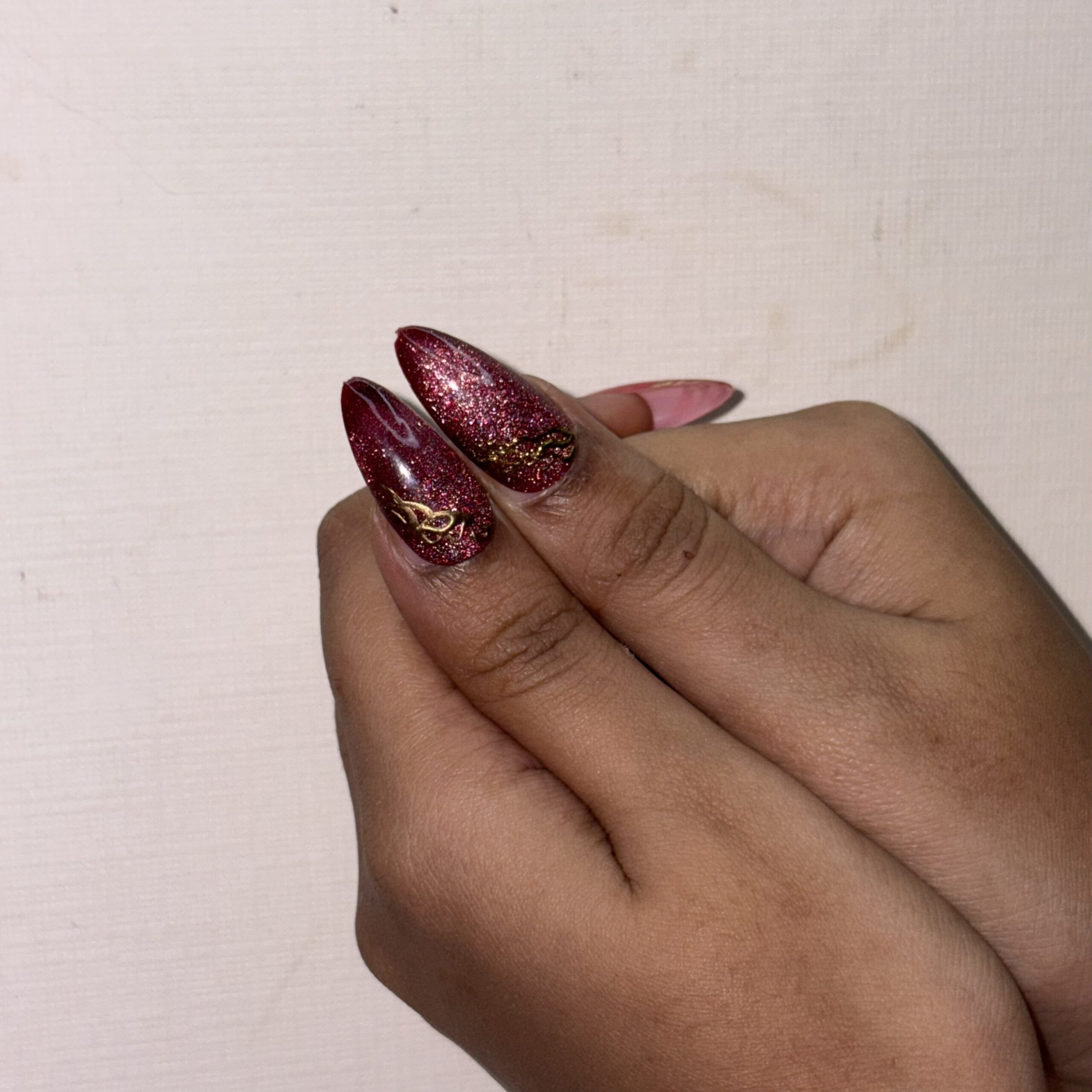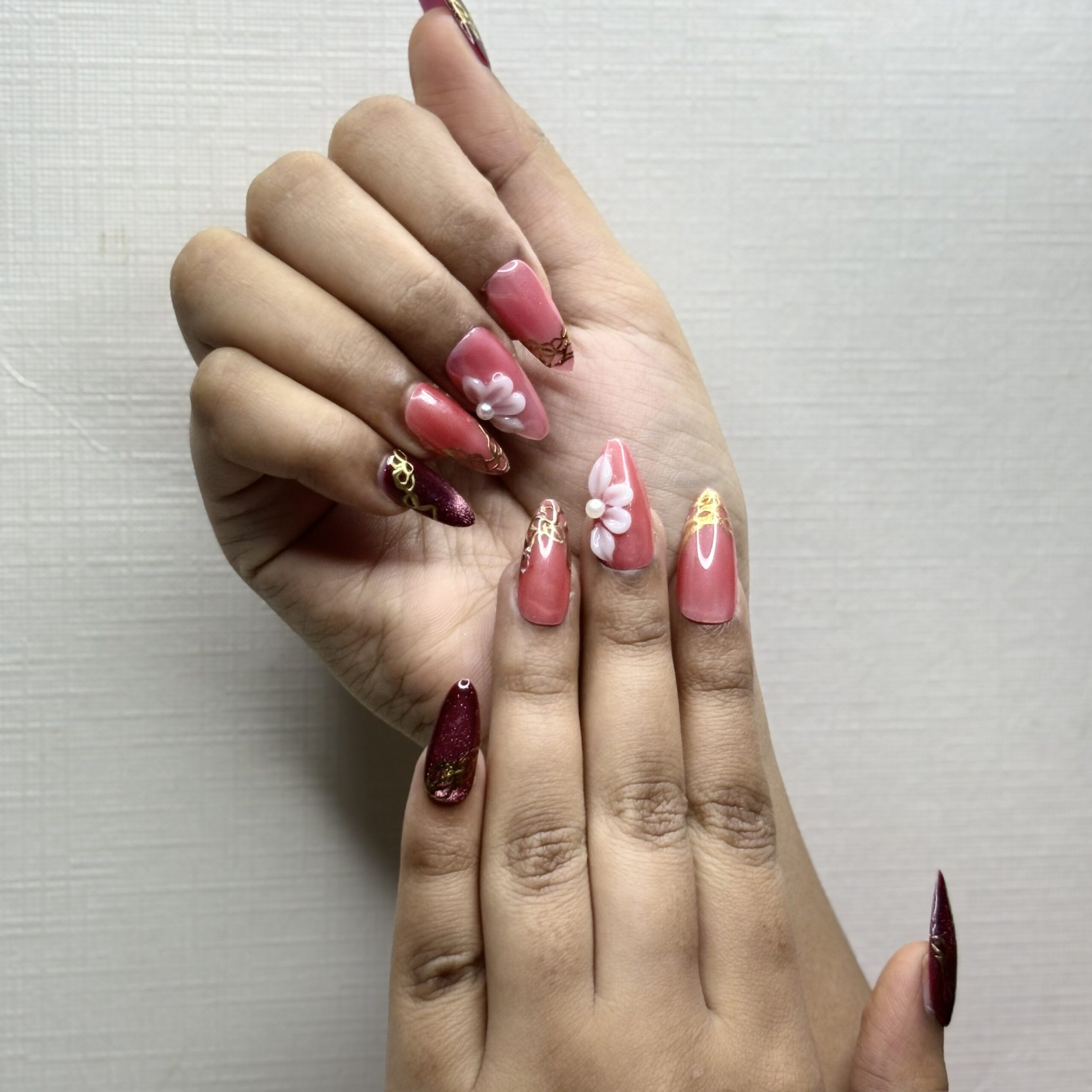 A glossy dual-tone blend of pink and maroon, highlighted with 3D floral art and fine gold detailing β€” designed in a medium almond shape for a rich and graceful look.