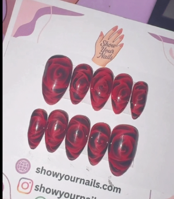 Scarlet Swirl Roses is a striking blend of bold color and delicate artistry. The deep scarlet cat-eye base catches the light beautifully, shifting tones with every movement. Hand-painted white rose swirls add a romantic, graceful touch, giving each nail a unique artistic charm.